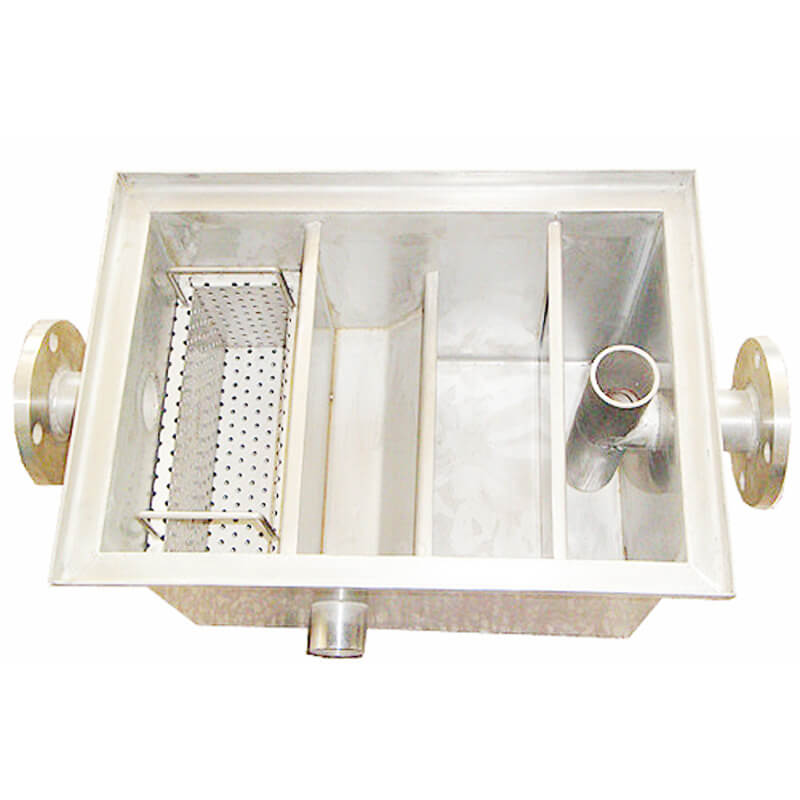 隔油池主要由兩槽'三槽'四槽分別組成,當(dāng)廚房排水流到第一槽時(shí),雜物框?qū)⑵渲械墓腆w雜物(菜葉等)截流除去,進(jìn)入第二槽后,利用油水密度差使油水分離。廢水沿第二槽隔油板向下流動(dòng),進(jìn)入第三槽后從物理裝置凈化流出,再經(jīng)出水管收集排出。第二槽中的油珠顆粒物沿隔油板集聚向上漂浮流動(dòng),始終浮在隔油池的第二槽內(nèi),經(jīng)過(guò)隔油處理的廢水則溢流入排水渠排出池外,進(jìn)行后續(xù)處理,以去除乳化油及其他污染物。