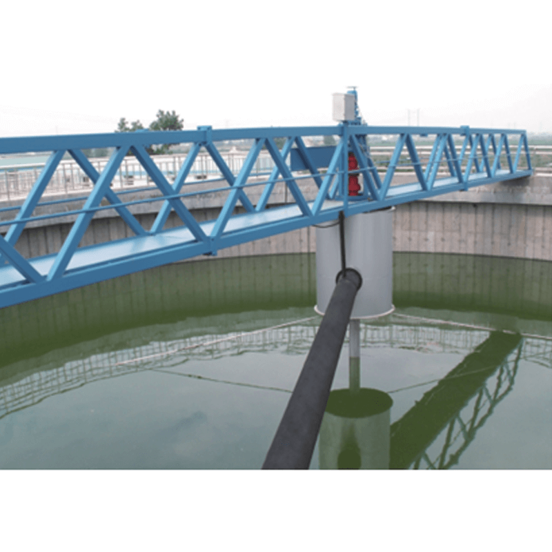 懸掛式中心傳動刮泥機主要由減速驅(qū)動機構(gòu)、中心傳動裝置、刮泥系統(tǒng)、水下軸承及集泥槽等部件組成,整臺刮泥機的荷載都作用在固定橫跨池徑的工作橋上。適用于給排水過程中水廠或污水處理廠直徑一般不大于20m的輻流式(圓形)沉淀池的污泥刮集和排除。